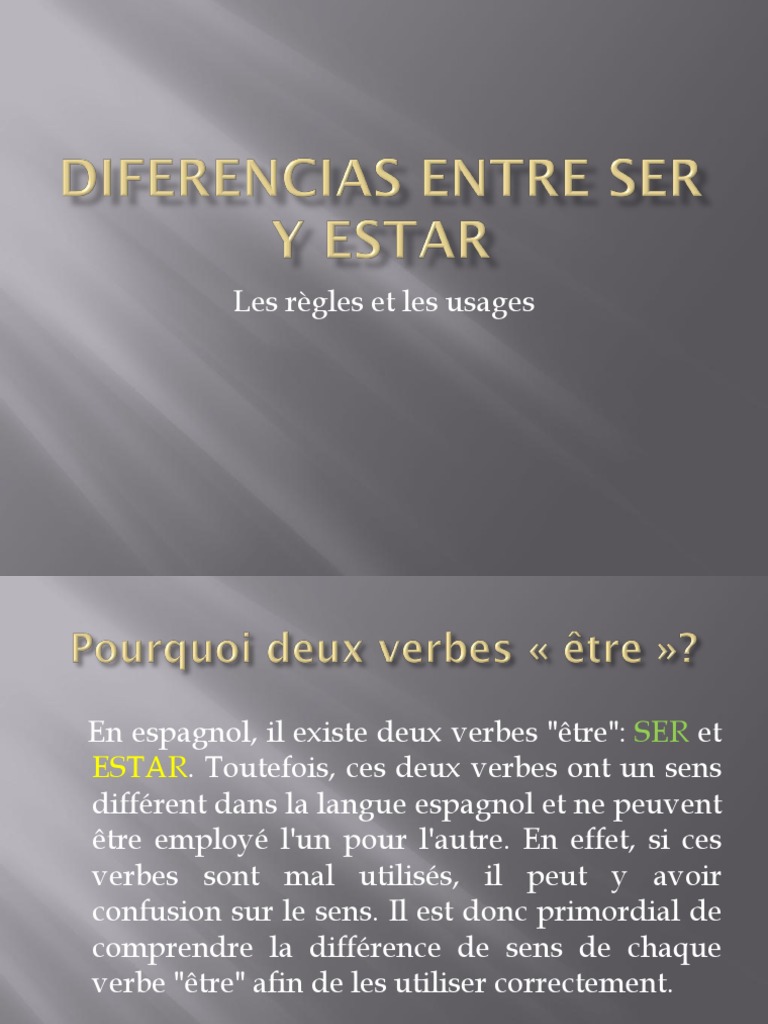3 from On l'utilise surtout pour se présenter ou pour décrire quelque chose ou quelqu'un. Traduction du verbe être en espagnol,. Merci de vous connecter au club pour sauvegarder votre résultat. Comment conjuguer le verbe ser en espagnol. Conjuguer le verbe espagnol estar à indicatif, subjonctif, impératif, infinitif, conditionnel, participe, gérondif. Les verbes ser et estar sont associés à des prépositions bien précises concernant certaines expressions. Il faut savoir qu'en espagnol il y a deux verbes être et qui vont s'utiliser selon un contexte bien défini: 'le verbe 'être' en français = le verbe 'ser' et 'estar' en espagnol.